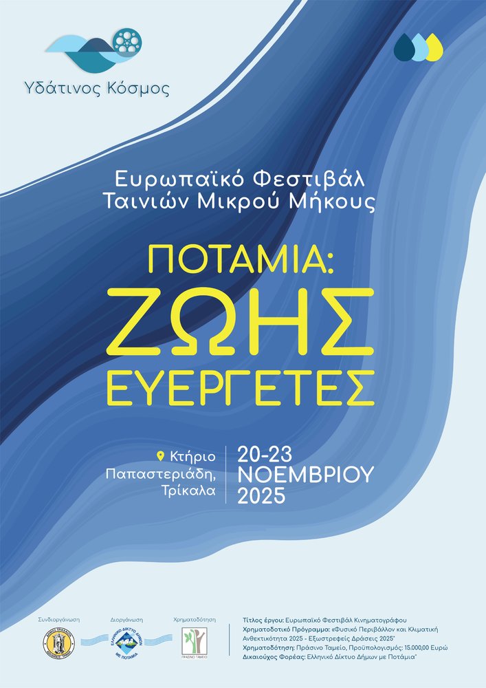 Το Ελληνικό Δίκτυο Δήμων με Ποτάμια, σε συνεργασία με το Δήμο Τρικκαίων και με χρηματοδότηση του Πράσινου Ταμείου, διοργανώνει από τις 20 έως 23 Νοεμβρίου 2025 στην πόλη των Τρικάλων, κτήριο Παπαστεριάδη, Ευρωπαϊκό Φεστιβάλ Κινηματογράφου Ταινιών Μικρού Μήκους με θέμα: ‘Υδάτινος Κόσμος’, «Ποτάμια: Ζωής Ευεργέτες».